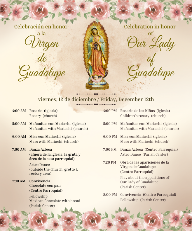 Saturday Vigil: 4:30 pm English, 6:30 pm SpanishSunday: 7:30 am English, 9:15 am Spanish, 11:30 am English, 1:30 pm Spanish, 4:00 pm Bilingual (youth), and 6:30 pm Spanish.