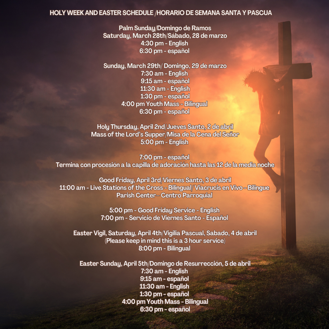 Saturday Vigil: 4:30 pm English, 6:30 pm SpanishSunday: 7:30 am English, 9:15 am Spanish, 11:30 am English, 1:30 pm Spanish, 4:00 pm Bilingual (youth), and 6:30 pm Spanish.